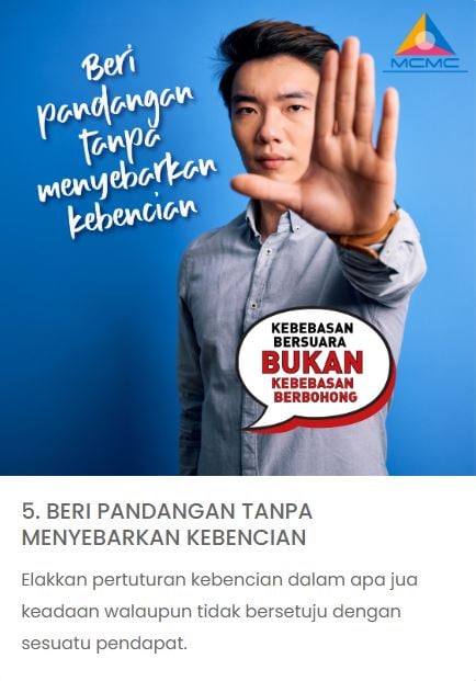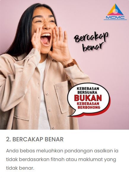 22 Oktober 2022 | Aktiviti TerkiniKempen ‘Kebebasan Bersuara bukan Kebebasan Berbohong’ merupakan salah satu kempen yang dianjurkan oleh Suruhanjaya Komunikasi dan Multimedia Malaysia. Pusat Internet Komuniti juga secara langsung terlibat dalam mempromosikan kempen ini kepada semua pengguna internet tidak kira di mana mereka berada. Objektif kempen ini adalah untuk mempromosikan nilai-nilai positif yang harus diamalkan oleh pengguna internet seperti bercakap benar, bijak menilai, beringat bila bercakap serta memberi fokus kepada impak berita palsu kepada masyarakat. Mesej utama yang ingin disampaikan melalui kempen ini adalah jangan kongsi pembohongan, mempromosikan portal sebenarnya.my dan mengingatkan kepada rakyat Malaysia bahawa membuat dan menyebarkan kandungan palsu atau tidak benar adalah tingkah laku jelik yang tidak boleh diterima. Diharap dengan adanya kempen ini dapat memberi kesedaran kepada netizen Malaysia agar bersama-sama menggunakan internet secara berhemah.